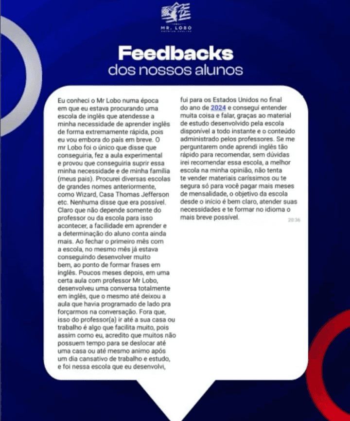 A MR LOBO é focada exclusivamente em líderes, executivos e empresários que precisam de resultado real em inglês: aulas estratégicas, feedbacks claros e evolução percebida nas reuniões, nas viagens e nos negócios – não no papel.